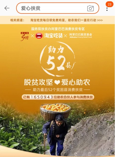 据悉,在淘宝APP上搜索关键词“爱心扶贫”或“爱心助农”即可到达专区页面。专区显示,正助力最后52个贫困县消费扶贫,在售商品包括甘肃礼县的苹果、贵州赫章的洋葱、四川布施的土豆、新疆皮山的葡萄干、云南镇雄的玉米等。